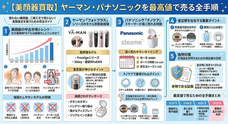 この記事では、中古美顔器市場のトレンドから、人気モデルの相場傾向、査定前に必ずチェックすべきポイント、そして正規品証明の重要性まで、あなたの美顔器を最高値で売るための全手順を徹底解説します。