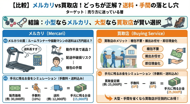 不用品の処分を考えたとき、多くの方が直面するのが「メルカリで自分で売るか、買取店に依頼してサクッと売るか」という悩みです。特にルームランナー、振動マシン、フィットネスバイクといった大型の健康器具や家電製品は、判断を誤ると「高く売れたはずなのに、送料と手間で結局損をした」という事態になりかねません。
