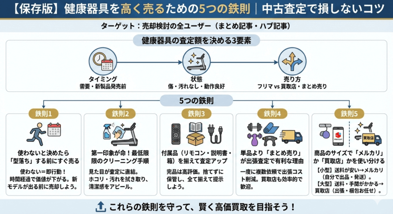 この記事では、中古の健康器具をできる限り高く売るための「5つの鉄則」を徹底解説します。査定でがっかりしないために、そしてあなたの健康器具の価値を最大化するために、ぜひ最後までご覧ください。